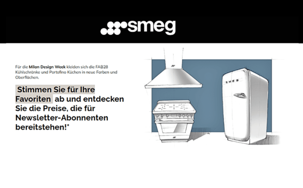 WÄHLE DEINE LIEBLINGSFARBE Preisverleihung mit Endverlosung Veranstalter: SMEG SPA Produkte: Marke SMEG Preise: FAB Kühlschrank, Espressomaschine + elektrische Kaffeemühle, Filterkaffeemaschine, 2-Scheiben-Toaster, Mini-Mixer & Smoothie-Maker Länder: Europäische Union, Schweiz, Vereinigtes Königreich, Norwegen Dauer: April – Mai 2024