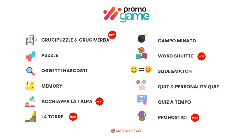 PromoGame: organizza dei minigiochi per intrattenere e premiare il tuo pubblico Informa, premia e fidelizza i tuoi clienti in modo interattivo e divertente Vuoi promuovere il tuo brand e i tuoi prodotti in modo innovativo, leggero e coinvolgente? Organizza un PromoGame contest! Una promozione con gioco online per interagire con il tuo pubblico, facendolo divertire! Puzzle, crucipuzzle, memory, oggetti nascosti, quiz a tempo, slide and match… scegli il minigame più adatto per il tuo target e per l’obiettivo che vuoi raggiungere! I minigame sono completamente personalizzabili con immagini e colori del tuo brand e possono essere condivisi sui tuoi profili social. Tutti i minigiochi possono essere attivati sia per l’Italia che per l’estero 🌍 PromoGame ti supporta nel perseguimento di molteplici obiettivi: Incrementare l’awareness Lanciare nuovi prodotti e/o promuovere quelli esistenti Coinvolgere i consumatori Generare nuovi lead Intrattenere il tuo target Informare ed educare il pubblico Come funziona PromoGame? Per partecipare a un Promogame l’utente deve andare sul sito, giocare, registrarsi e il gioco è fatto.Il flusso è semplice, chiaro e divertente! Qual è il vantaggio di PromoGame contest? Con PromoGame puoi “vestire” in modo sempre diverso le tue promozioni.Puoi infatti: ottimizzare i risultati di una campagna di distribuzione codici sconto/coupon; informare il tuo pubblico divertendolo; animare e rendere originali i tuoi concorsi a premi; incentivare le redemption e le partecipazioni plurime. Personalizza il tuo minigame I minigame possono essere completamente personalizzati in tutti i loro aspetti grafici e testuali. Tutti gli elementi possono contribuire a creare un’esperienza in linea con la tua immagine e prevedere addirittura che specifici elementi, come i tuoi stessi prodotti, diventino parte integrante del gioco stesso. In base al target a cui ti rivolgi puoi scegliere: il livello di difficoltà dei giochi il tempo entro cui risolverli. se vuoi rendere visibile la classifica dei partecipanti per incoraggiare la competizione. Se utilizzare la classifica per aumentare il coinvolgimento del pubblico sui tuoi canali social SCEGLI IL MINIGAME: Puzzle Memory Slide&Match Acchiappa la talpa NEW Campo Minato Crucipuzzle Cruciverba NEW Oggetti nascosti Quiz a tempo Pronostici NEW Word shuffle La torre NEW 🧩 GUARDA TUTTI I GIOCHI DISPONIBILI E PROVA LA DEMO!