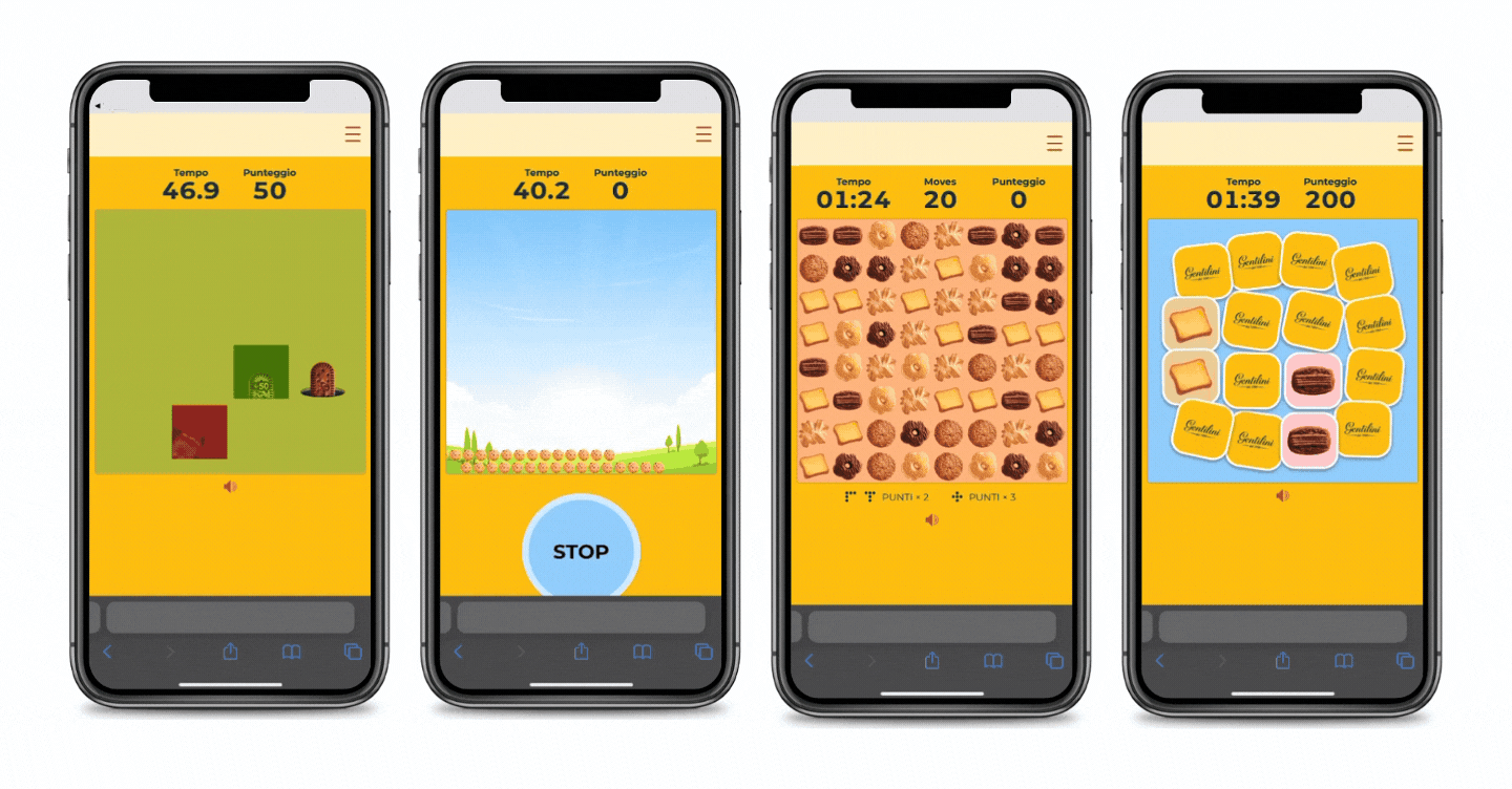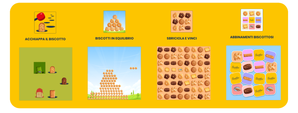 I 4 minigame “Acchiappa il Biscotto,” “Biscotti in Equilibrio,” “Sbriciola e Vinci” e “Abbinamenti Biscottosi” trasformano poi ogni sfida in un’esperienza unica e coinvolgente con il brand che diventa protagonista del gioco.