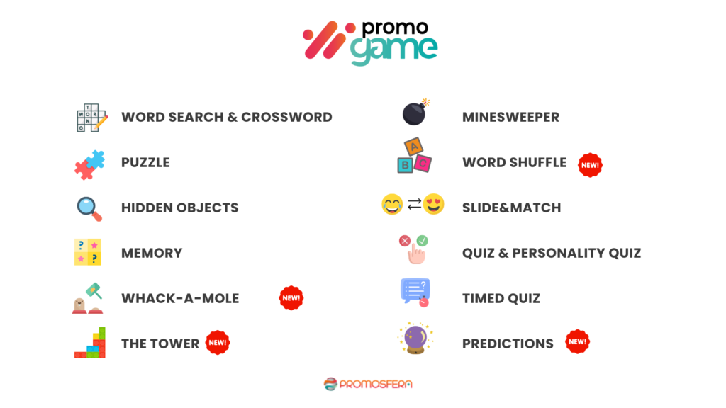 PromoGame contest: organise mini-games to entertain and reward your audience Inform, reward and retain your customers in an interactive and fun way: run a promogame contest! Do you want to promote your brand and your products in an innovative, light and engaging way? Organise a PromoGame contest! A promotion with an online game to interact with your audience, while they are having fun! Puzzles, crossword puzzles, memory games, hidden objects, timed quizzes, slide and match games… choose the most suitable game for your target and for the goal you want to achieve! The games are fully customisable with images and colours of your brand and they can be shared on your social profiles. PromoGame contest supports you in the pursuit of multiple goals: Increasing awareness; Launching new products and/or promoting the existing ones; Engaging consumers; Generating new leads; Entertaining your target; Informing and educating the audience. What is the advantage of PromoGame contest? With PromoGame you can always “dress” your promotions in different ways.You can use mini-games to: optimise the results of a discount coupon distribution campaign; inform your audience in the time they are having fun; animate and make your prize-promotions original; encourage redemption and multiple participations. Complete customisation of mini-games Online promogames can be fully customised in all their graphic and textual aspects. All the elements can help to create an experience in line with your image and even provide that specific elements, like your own products, become an integral part of the game itself. Depending on the target you are addressing, you can choose:the difficulty level of the games;the time within which to solve them; if you want to make the ranking of participants visible to encourage competition; whether to use ranking to increase audience engagement on your social channels. AVAILABLE MINIGAMES: 🧩 CONTACT US!