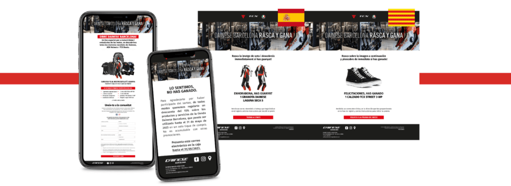 “DAINESE SCRATCH AND WIN” prize-draw in Spain, France and Germany 30 May 2023 Dainese offers helmets, clothing and gift cards but only for newsletter subscribers Dainese organised the “DAINESE SCRATCH and WIN” prize-draw to encourage subscriptions to its information newsletter in Spain, France and Germany. To register and to participate in the prize-draw, consumers had to go to Dainese stores or connect to the dedicated site. In this way, Dainese achieved the dual objective of collecting new contacts for its future marketing activities and, at the same time, increasing traffic in its stores. Let’s see look in detail at how the promotional initiatives were structured. “DAINESE RASCA Y GANA” prize-draw in Barcelona and Madrid The prize-draw was organised to promote the opening of the DAINESE STORES in Barcelona and Madrid. Consumers were invited to visit the stores where they had to subscribe to the Dainese newsletter in order to participate in the competition. Inside the stores were placed tablets that offered the possibility to register through a form and, therefore, to play by scratching with a cursor the image offered to find out immediately if they had won one of the prizes at stake and which one. The prize pool included helmets, jackets, shoes, back protectors, gift cards and t-shirts. “DAINESE SCRATCH AND WIN” prize-draw in France and Germany In France and Germany, participation in prize-competitions could take place both by registering for the newsletter at the stores and on the dedicated website. Again, after registering, consumers could play and find out immediately if they had won and what prize. Prizes on offer included helmets, suits, jackets, shoes, back protectors and gift cards. The prize was then to be collected in your favourite store store, selected by the consumer at the time of registration. What goals can you achieve with an prize-contest? Organising a prize-competition can help you achieve several goals: Increase sales of your products or subscriptions to your services Make your customers even more faithful Increase awareness of your brand and/or product and increase user engagement Launch new products Acquire new contacts for subsequent marketing campaigns With its prize-competitions, Dainese set itself the objectives of expanding its database of contacts for its marketing activities, promoting the opening of new stores and increasing traffic in its stores. What’s your objective? Contact us and together we will design the most suitable prize-competition to help you reach it!