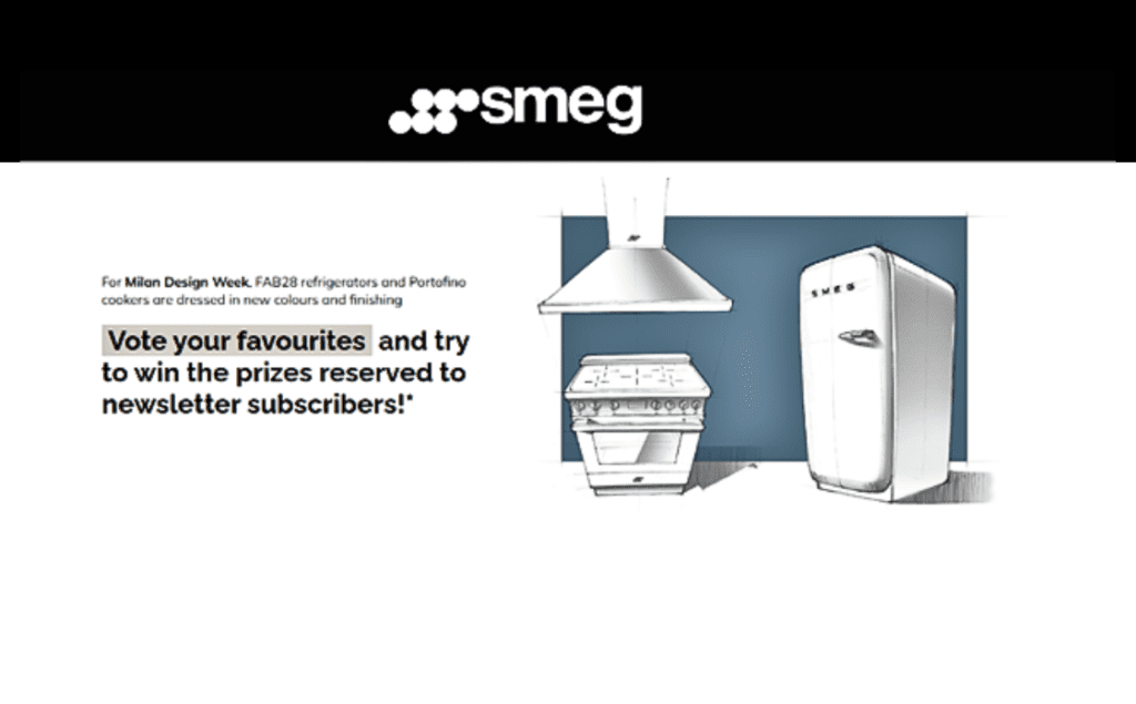Choose your favorite color Prize-promotion with final draw Promoter: SMEG SPA Products: SMEG Brand Prizes: FAB refrigerator, espresso coffee machine + electric coffee grinder, drip filter coffee machine, 2 slices toaster, mini blender & smoothie maker Period: April – May 2024 Countries: European Union, Switzerland, UK, Norway